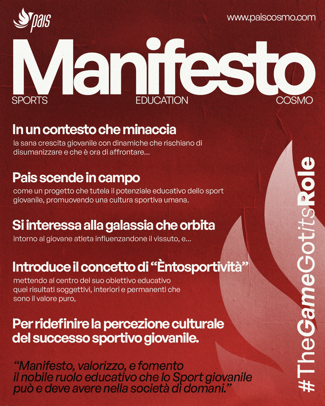 Pais è una filosofia: sostiene che lo Sport Giovanile si debba legare alla sfera dell’interiorità, per essere l’elemento chiave con cui promuovere e difendere la sana crescita giovanile contemporanea.